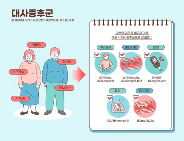 대사증후군이란 비만을 중심으로 고혈압, 고혈당, 고지혈증이 함께 나타나는 상태를 말합니다.